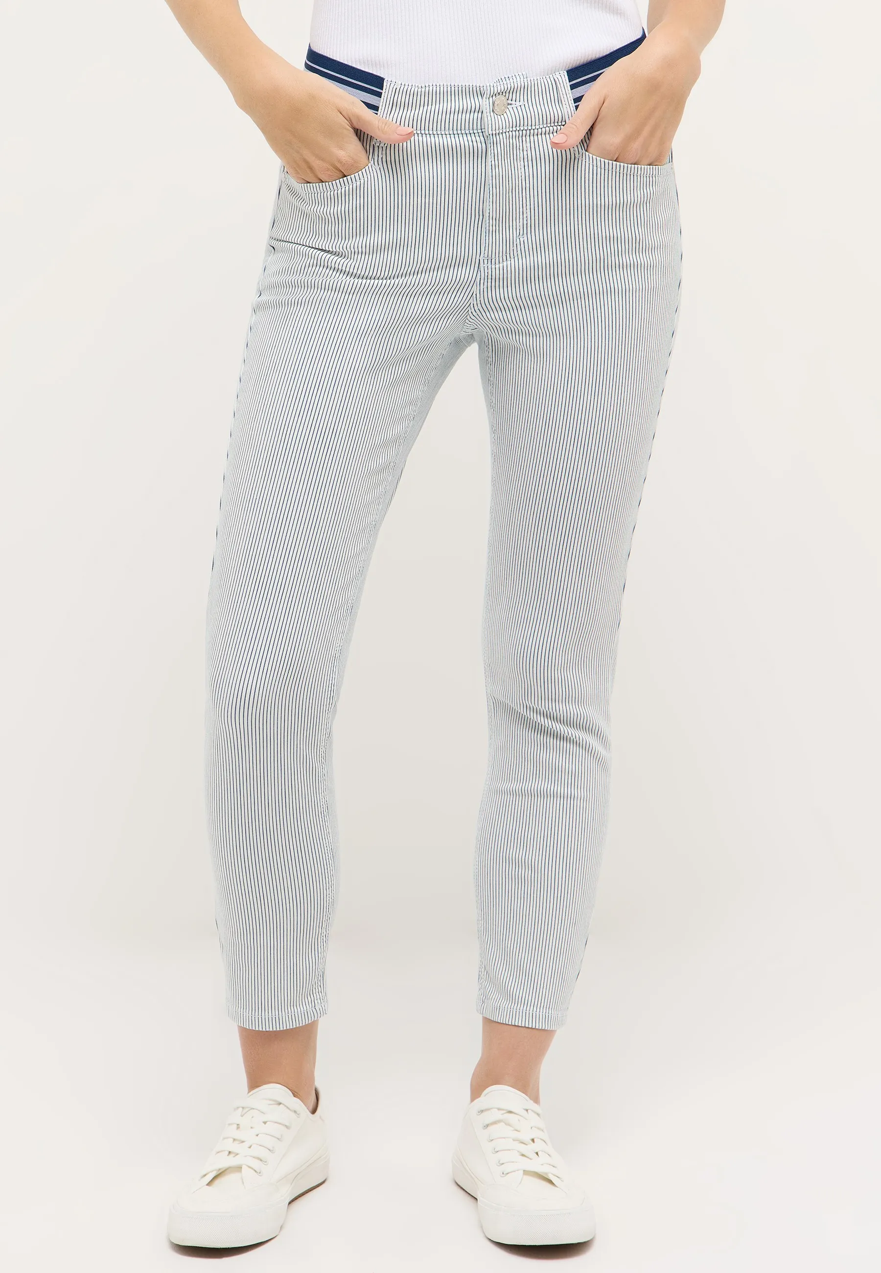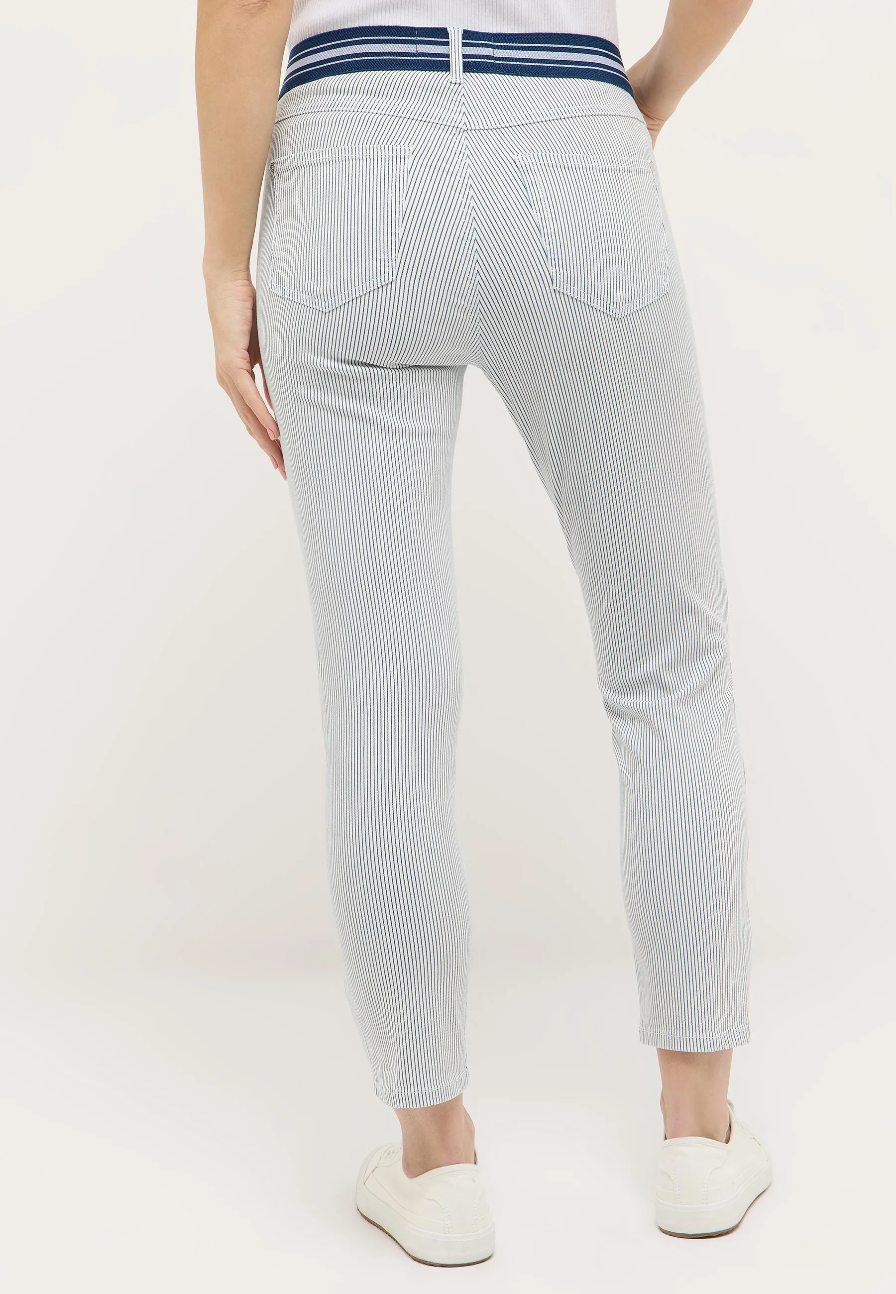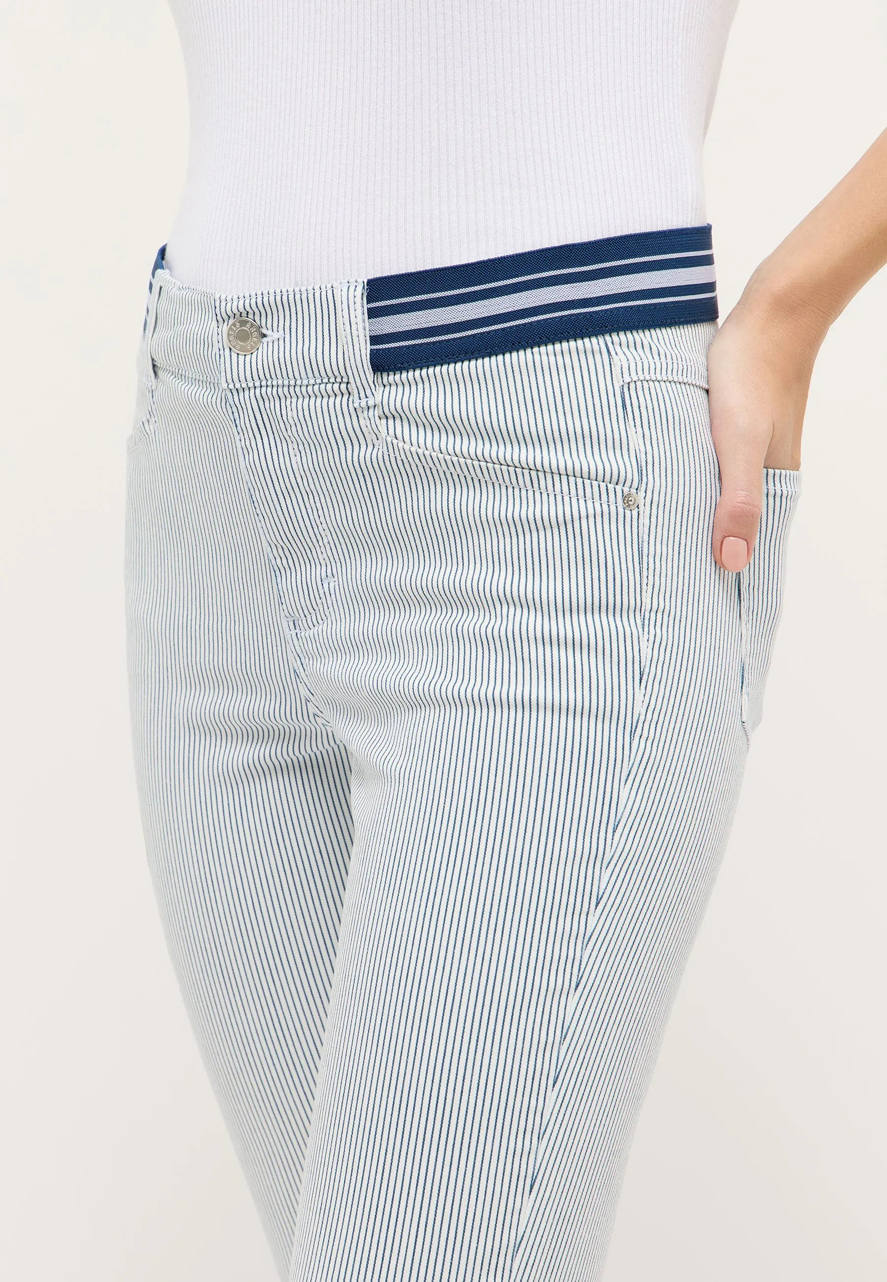 Erlebe den einzigartigen Stil der Ornella Sporty mit Dehnbund. Mit ihrem Slim Fit und schmalen Bein bietet sie nicht nur eine moderne Passform, sondern auch ein stylisches Streifenmuster für einen trendigen Look. Das einzigartige Stretch-Material garantiert bequemen Tragekomfort, während die mittlere Bundhöhe diese Hose zu einem vielseitigen und individuellen Kleidungsstück macht.