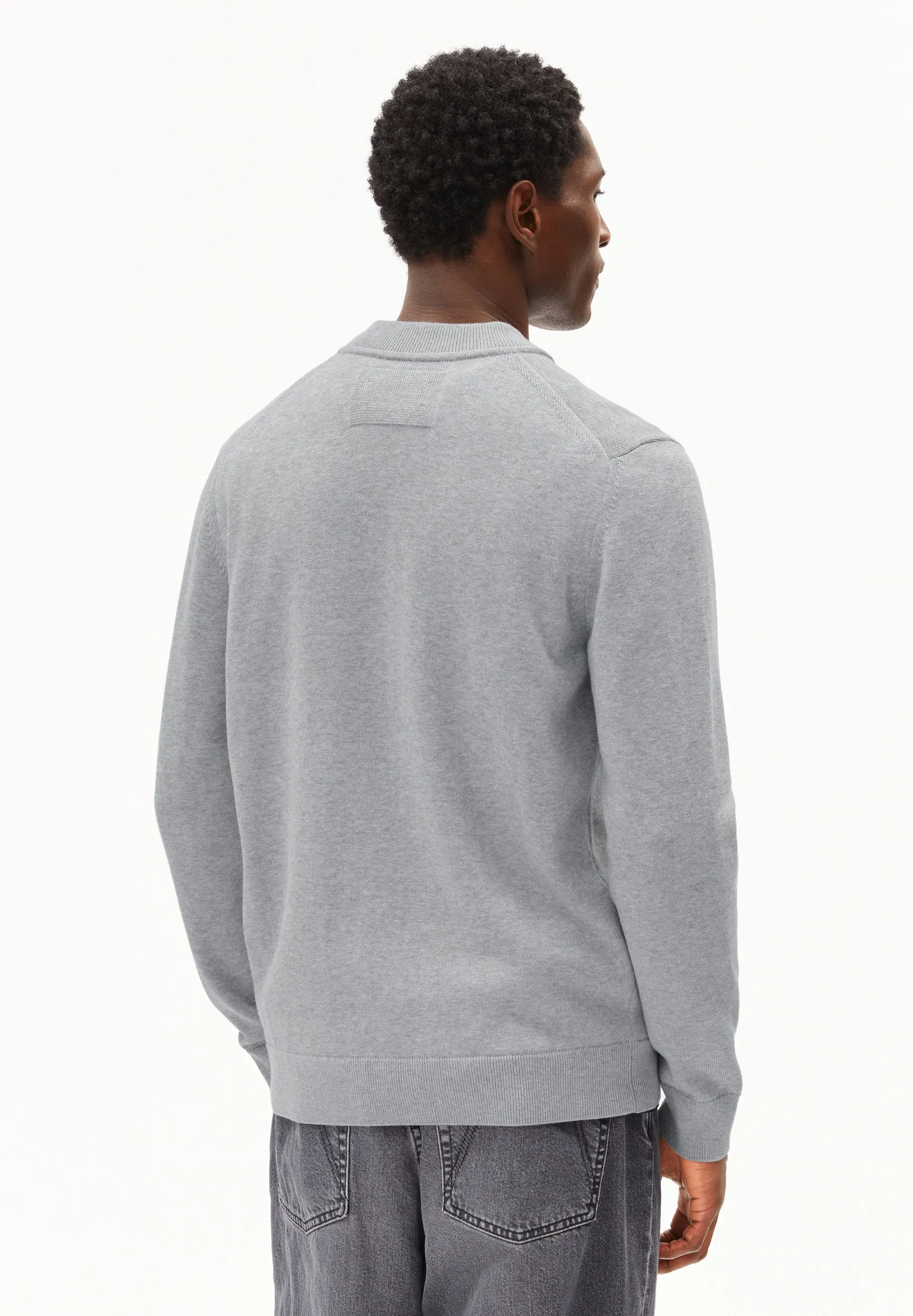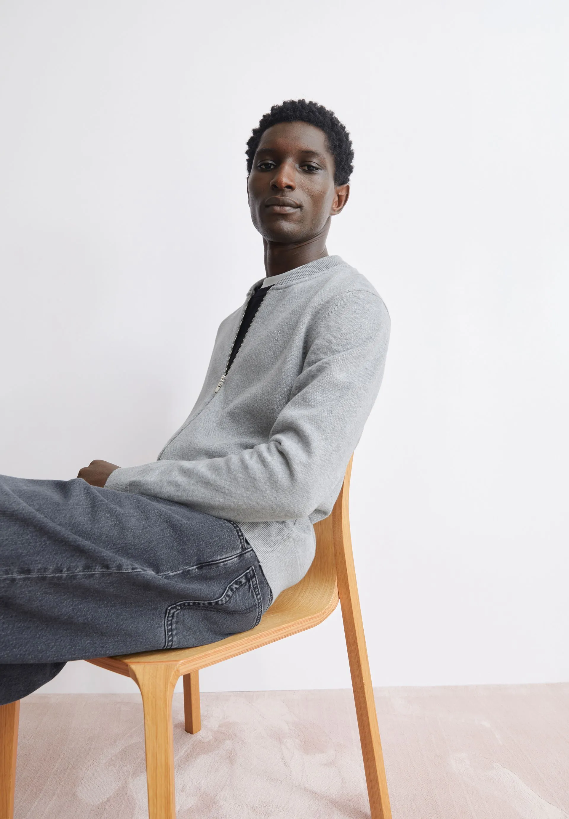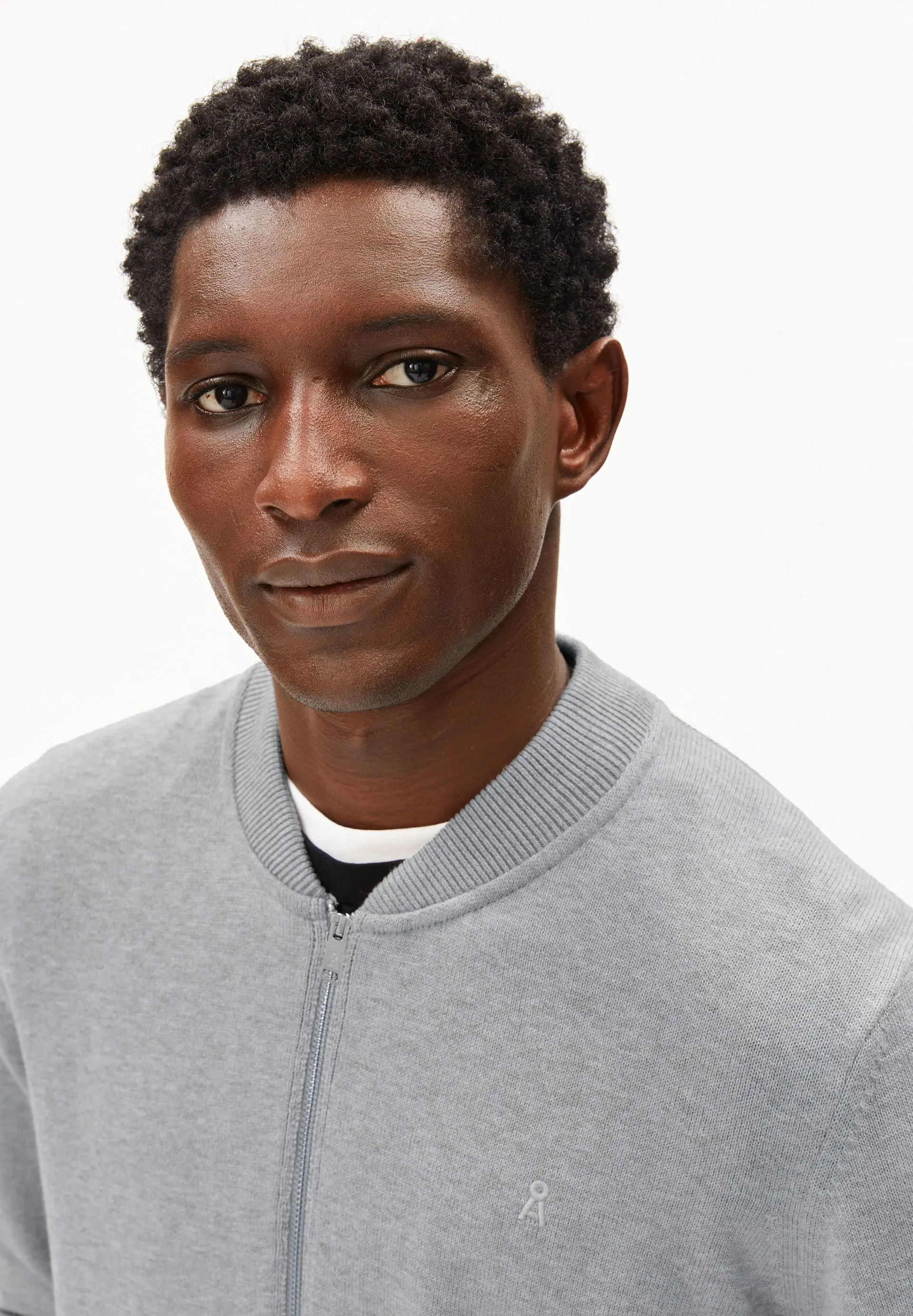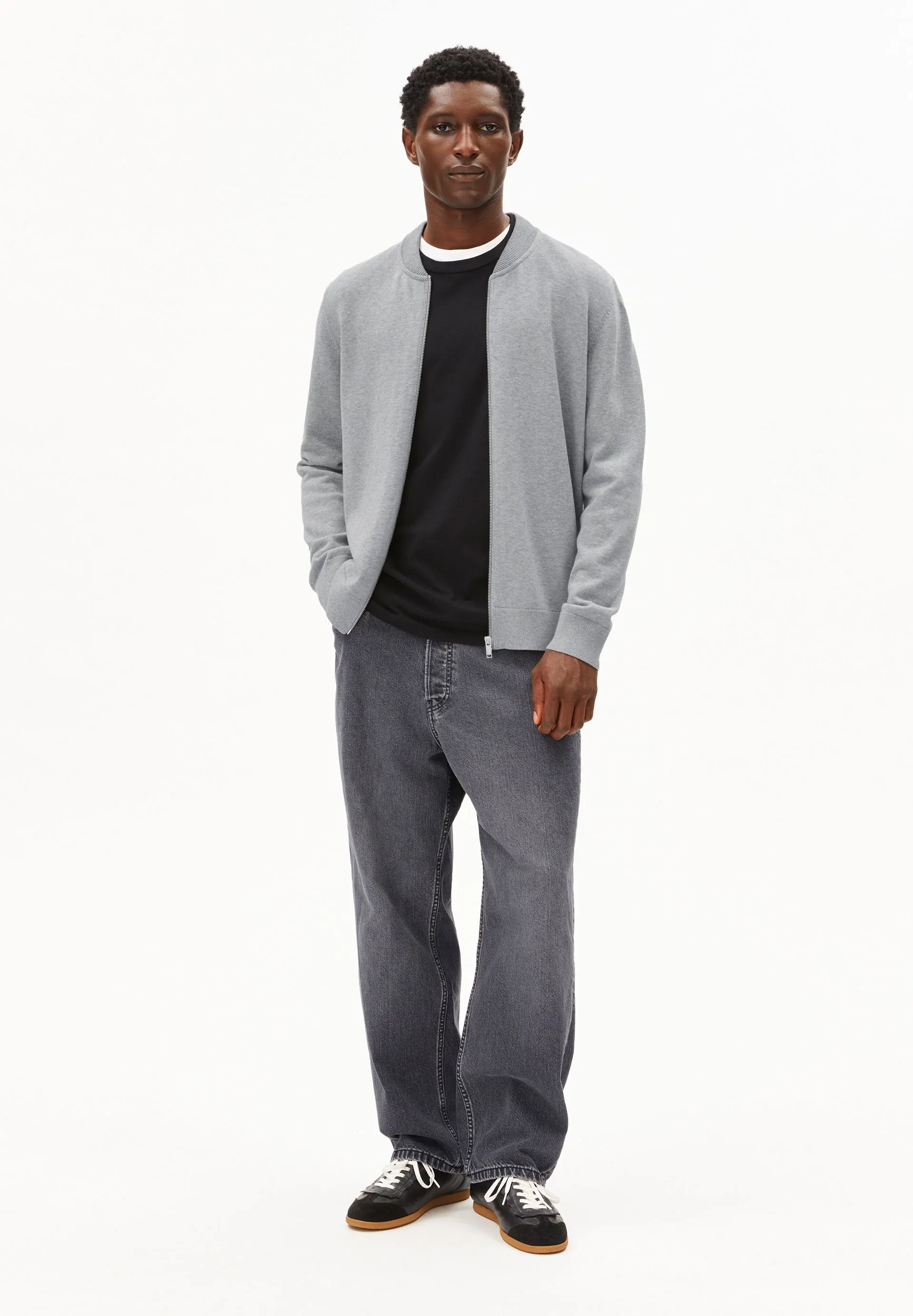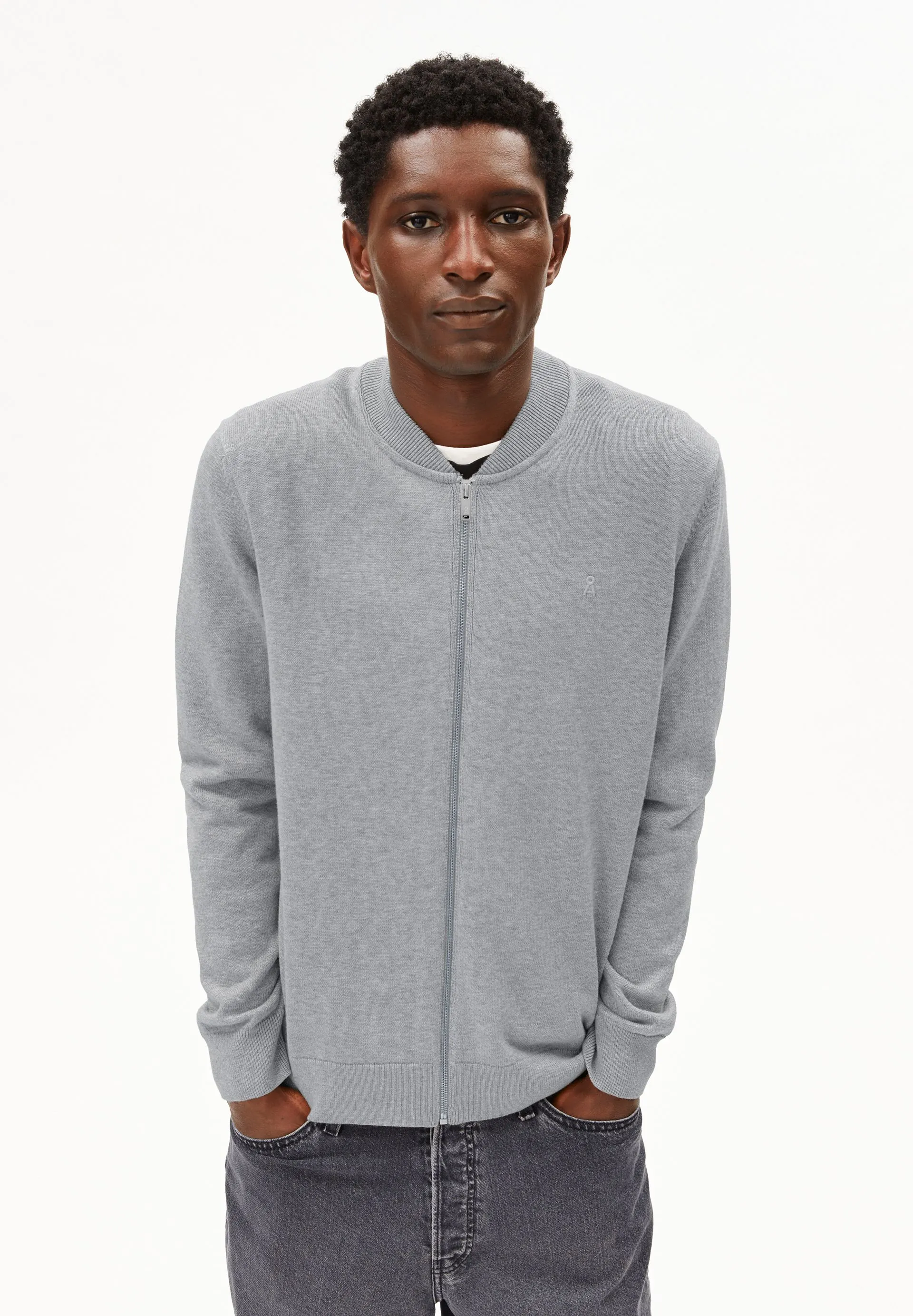 Our AGAAMON knit cardigan, made from pure organic cotton, features a loose fit, a classic blouson collar, and a practical zipper.