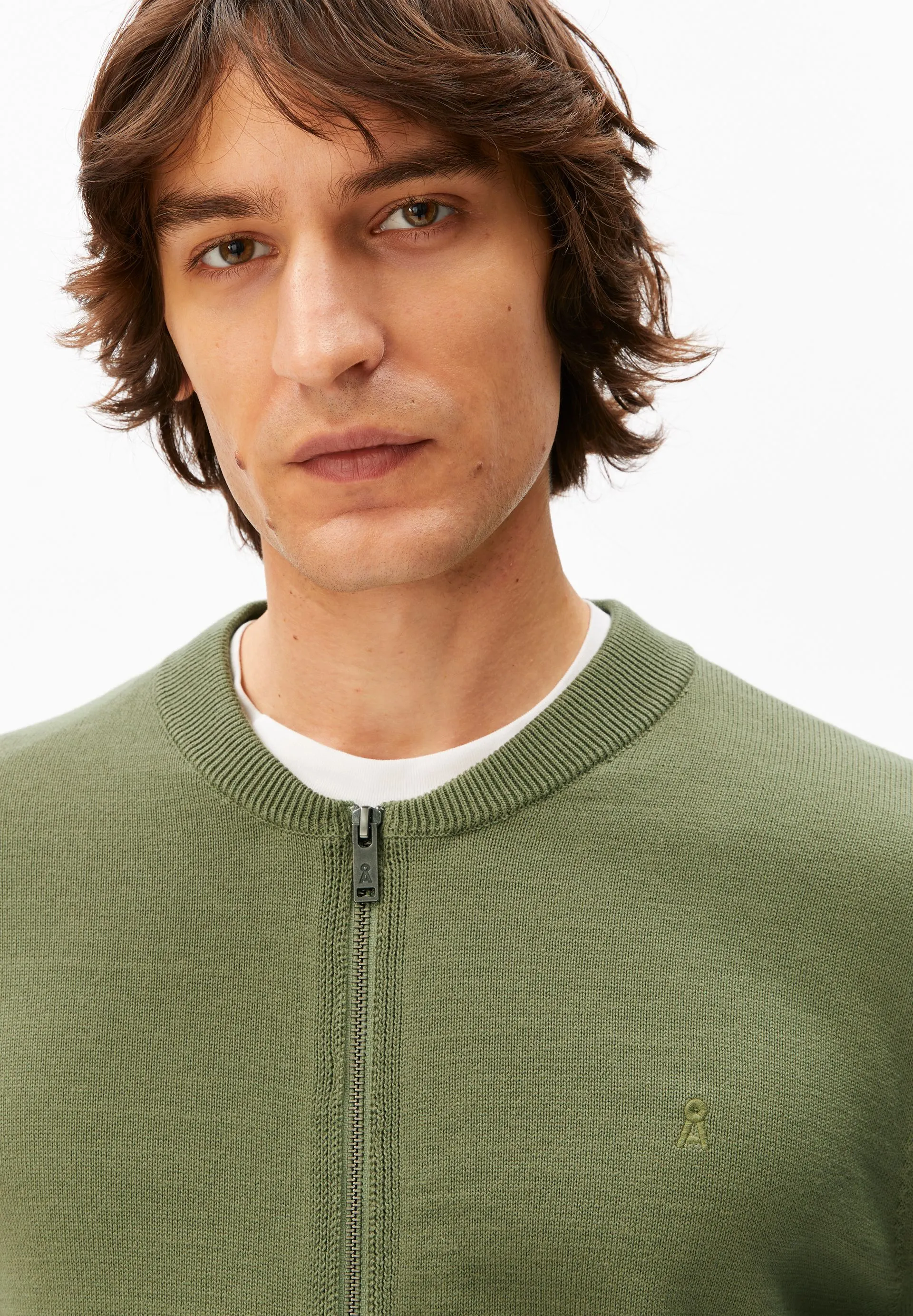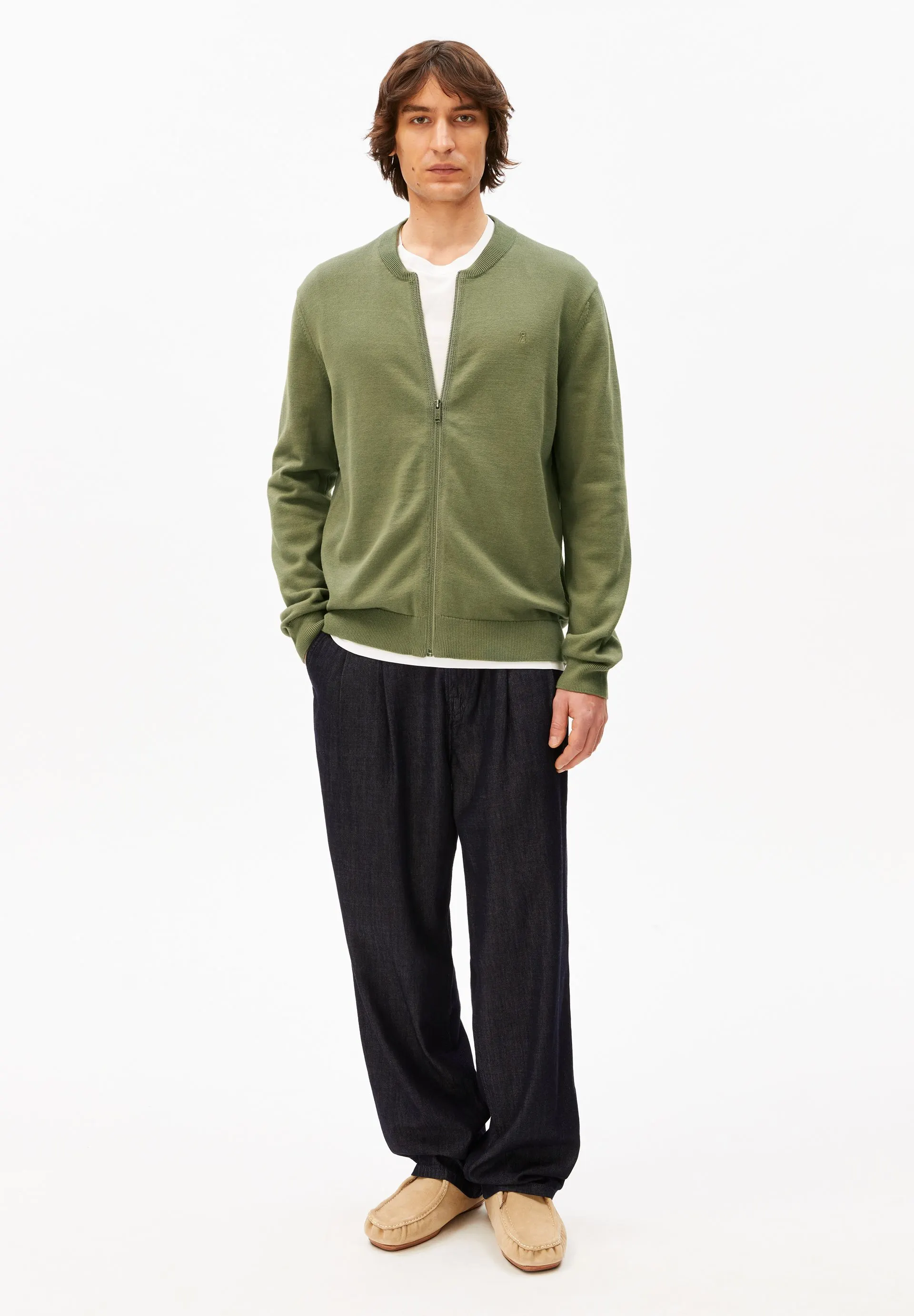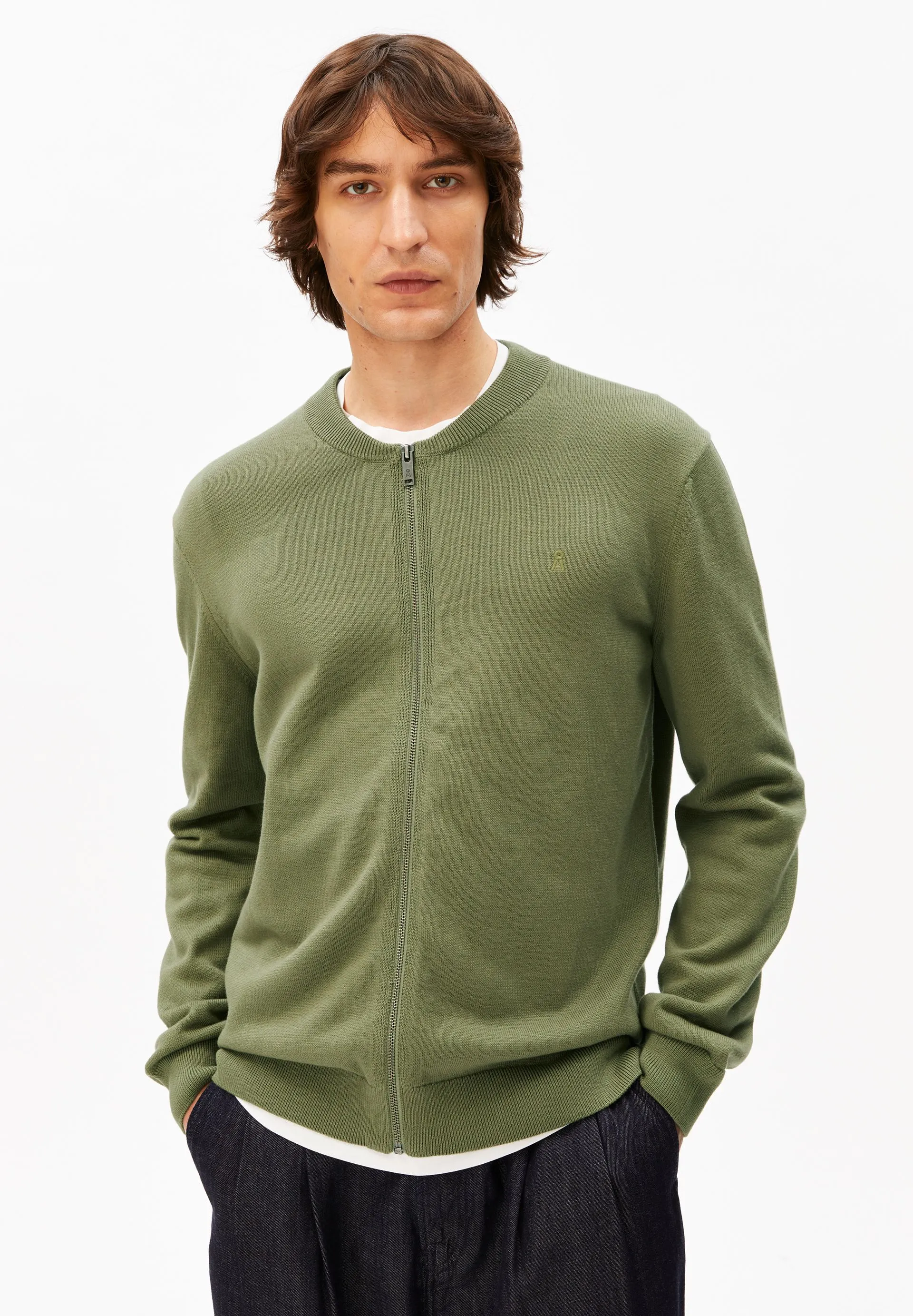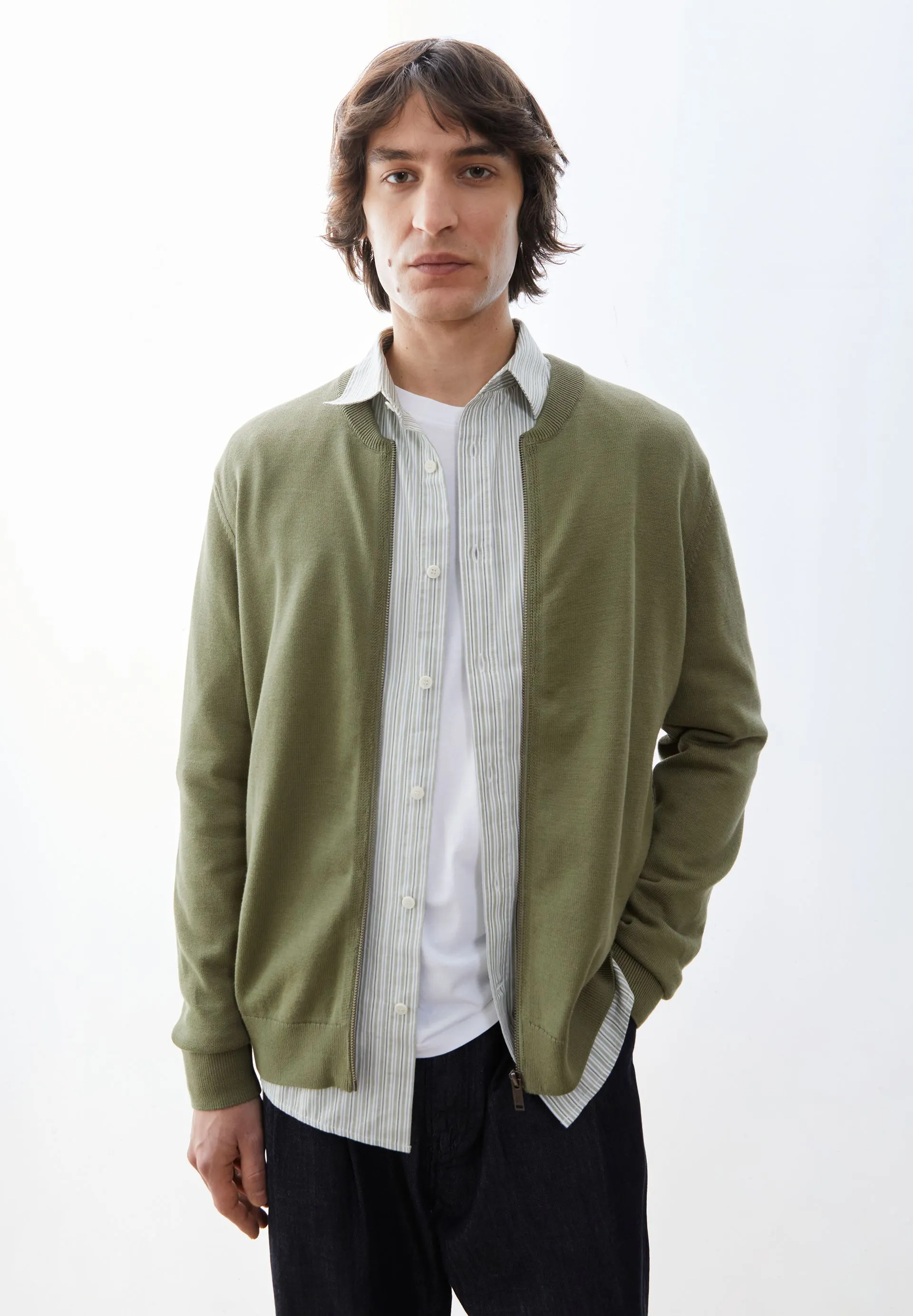 Our AGAAMON knit cardigan, made from pure organic cotton, features a loose fit, a classic blouson collar, and a practical zipper.