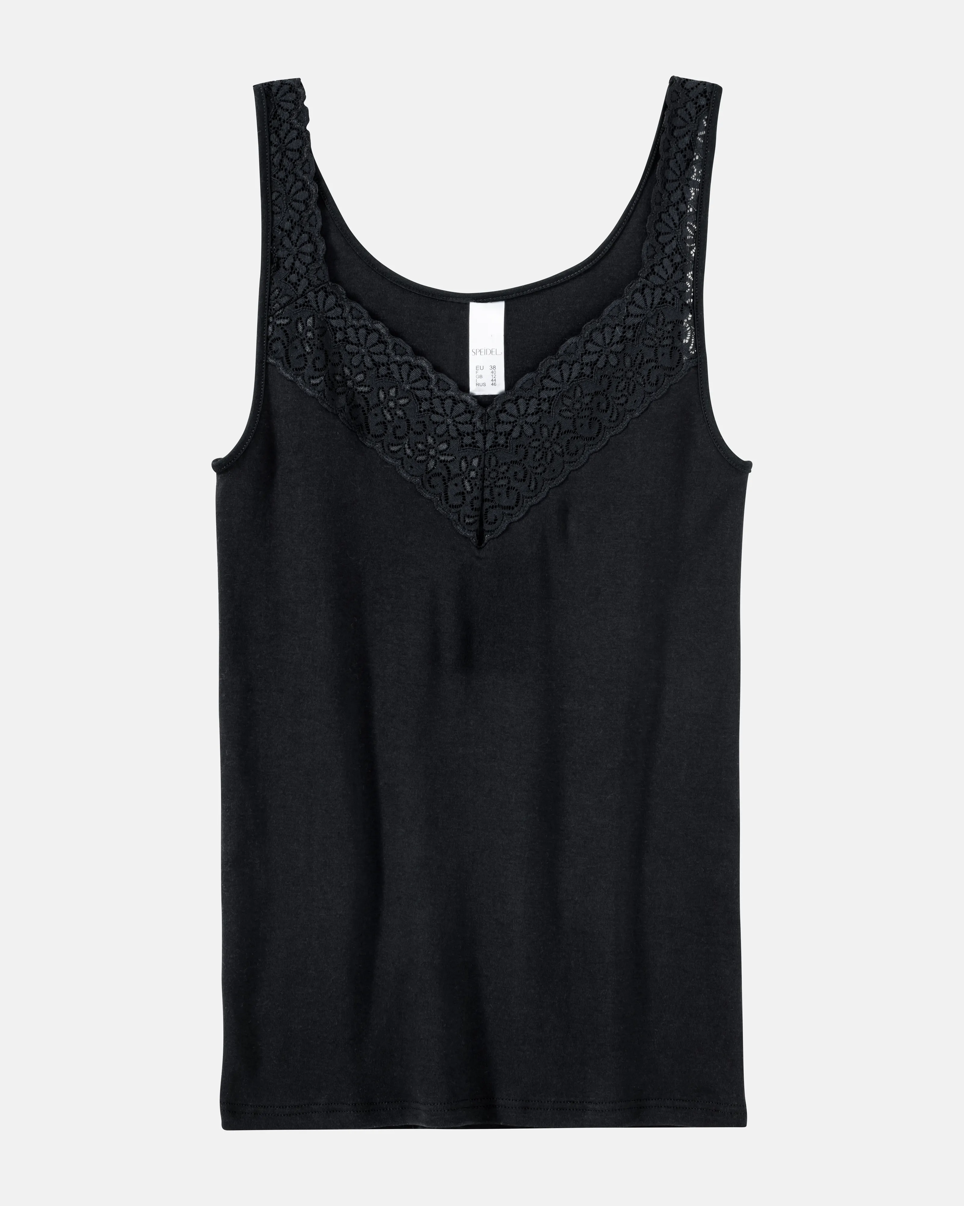 Superschoenes Achselhemd Natalie mit breitem elastischem Spitzenband am Ausschnitt. Feine supergekaemmte Baumwolle sorgt fuer ein angenehmes Tragegefuehl.