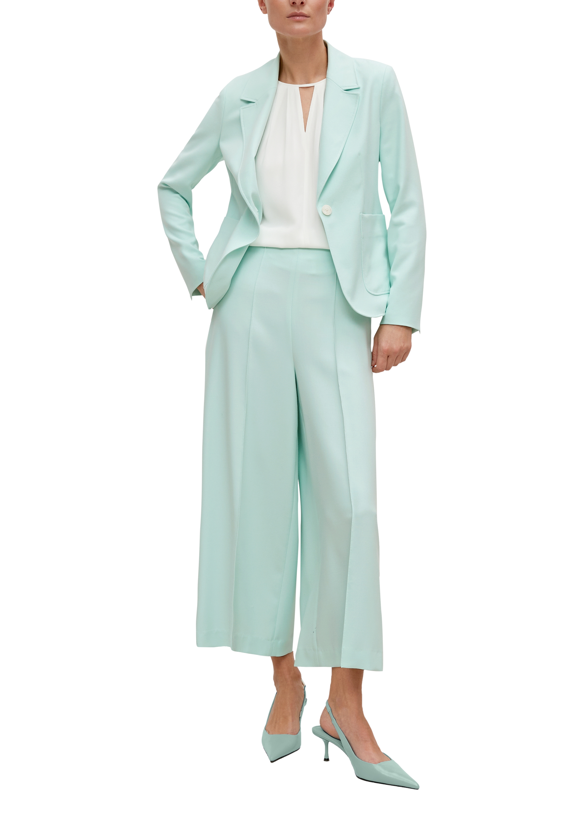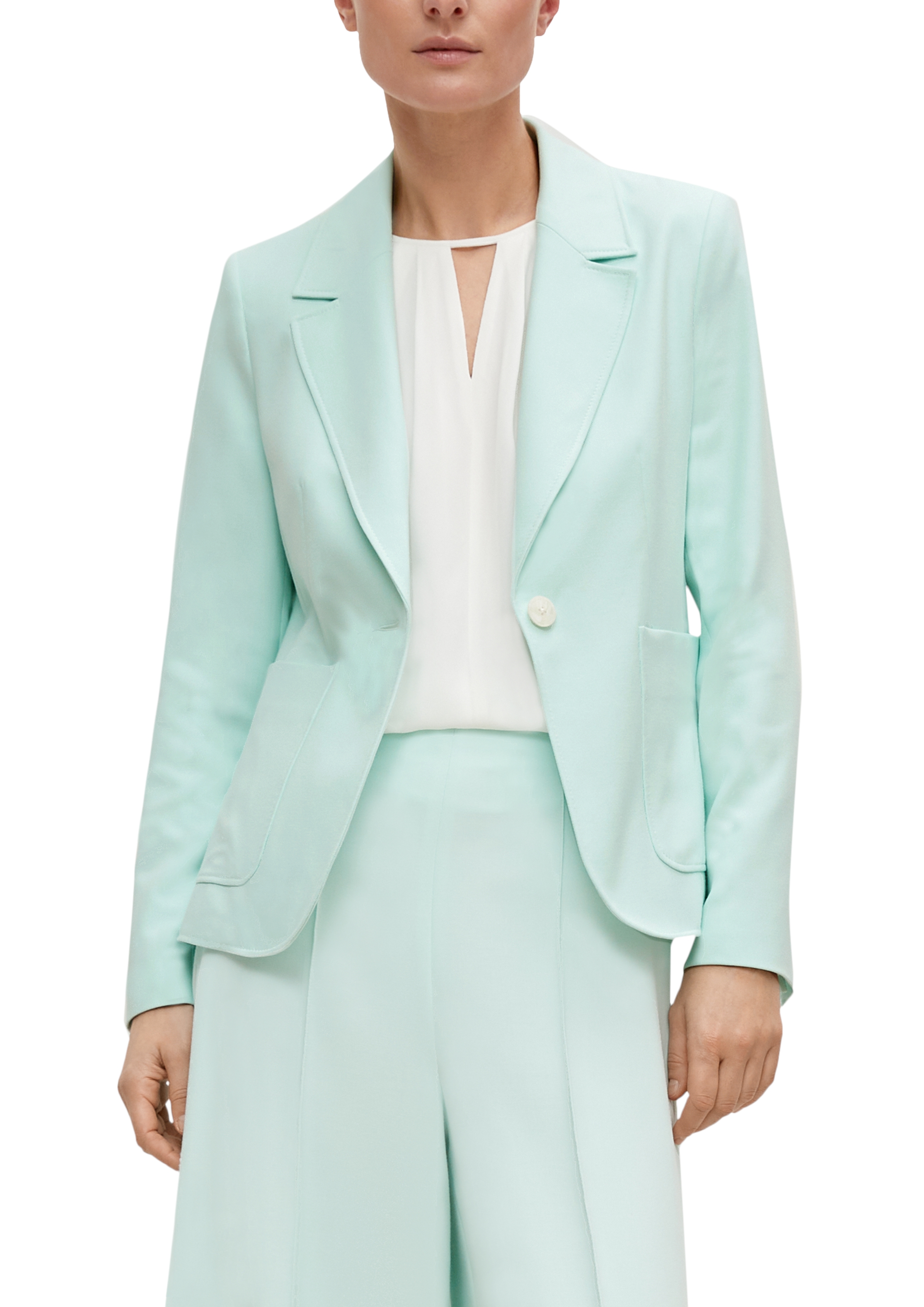 Zeitlos feminin: Der taillierte Blazer aus weichem Viskosemix umschmeichelt Ihre Silhouette. Sein Reverskragen und die aufgesetzten Taschen verleihen ihm eine elegante Note. Kombinieren Sie den Blazer mit einer Hose für einen cleanen Look oder wagen Sie Layering für kühlere Abendstunden. Lassen Sie sich von diesem Piece zu vielseitigen Styling-Optionen inspirieren.