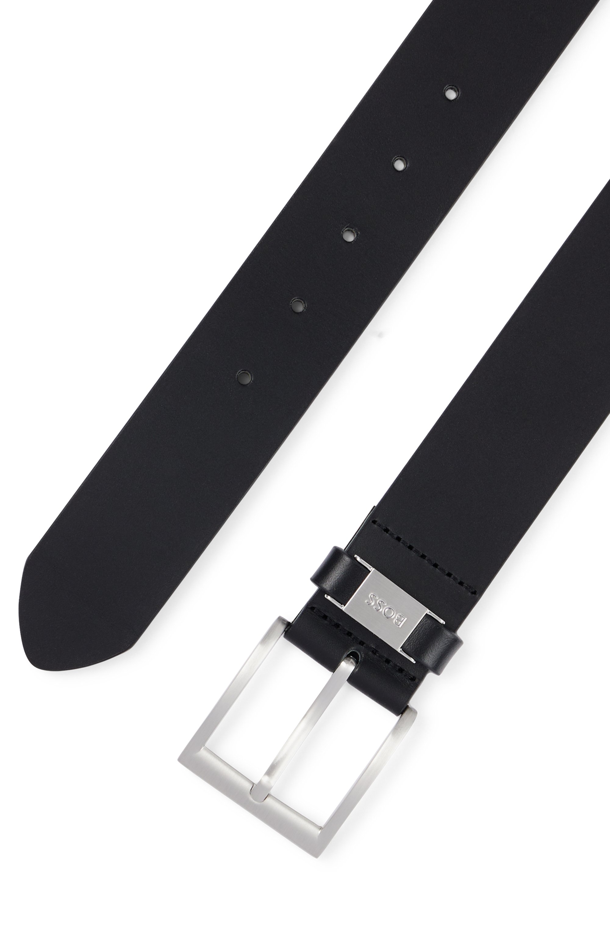Eleganter BOSS Gürtel aus gegerbtem italienischem Leder mit 4,0 Zentimetern Breite, der mit einem Logo-Detail aus Metall an der Schlaufe versehen ist. Für eine optimale Passform sollte der Gürtel eine Größe größer als dein Taillenumfang sein.