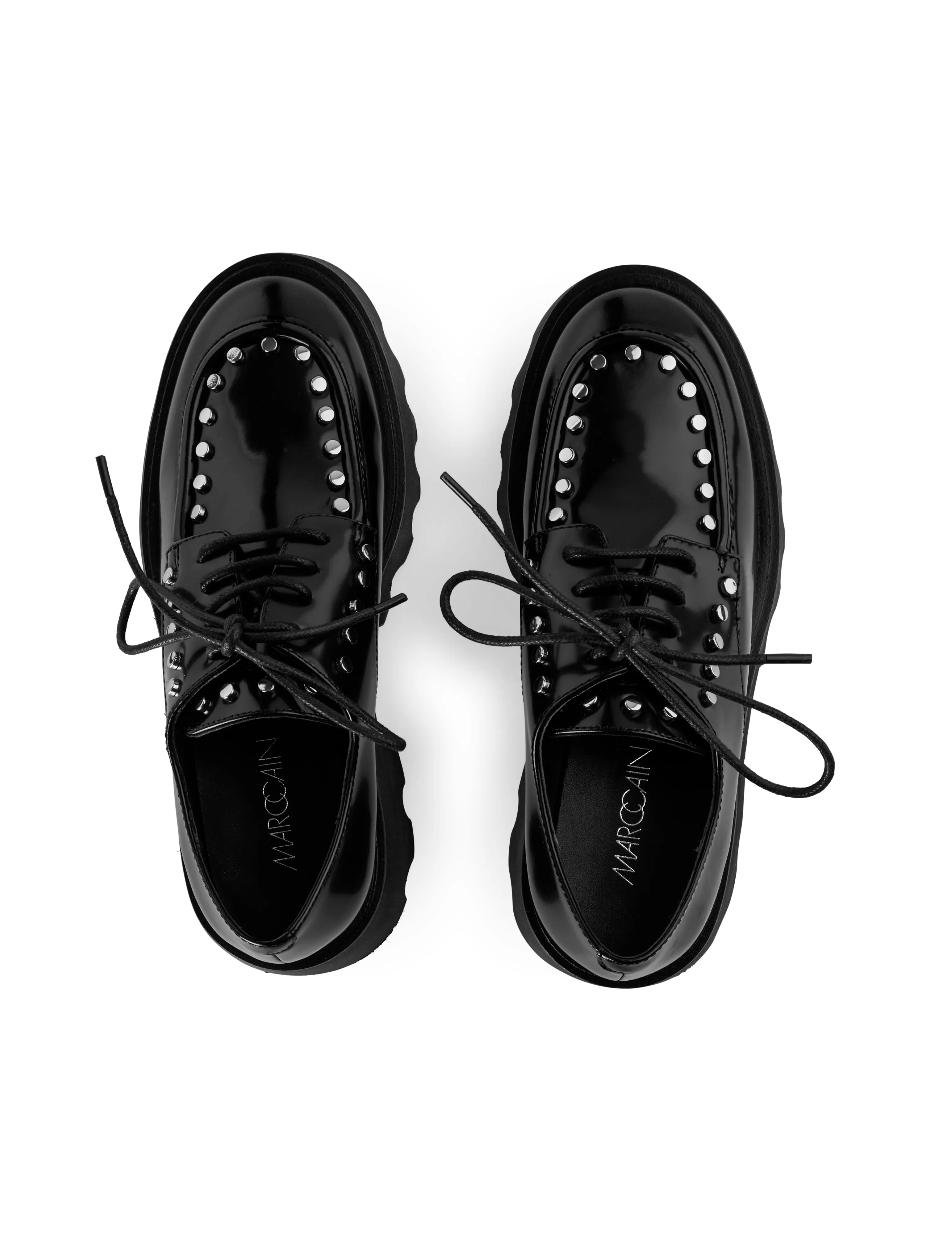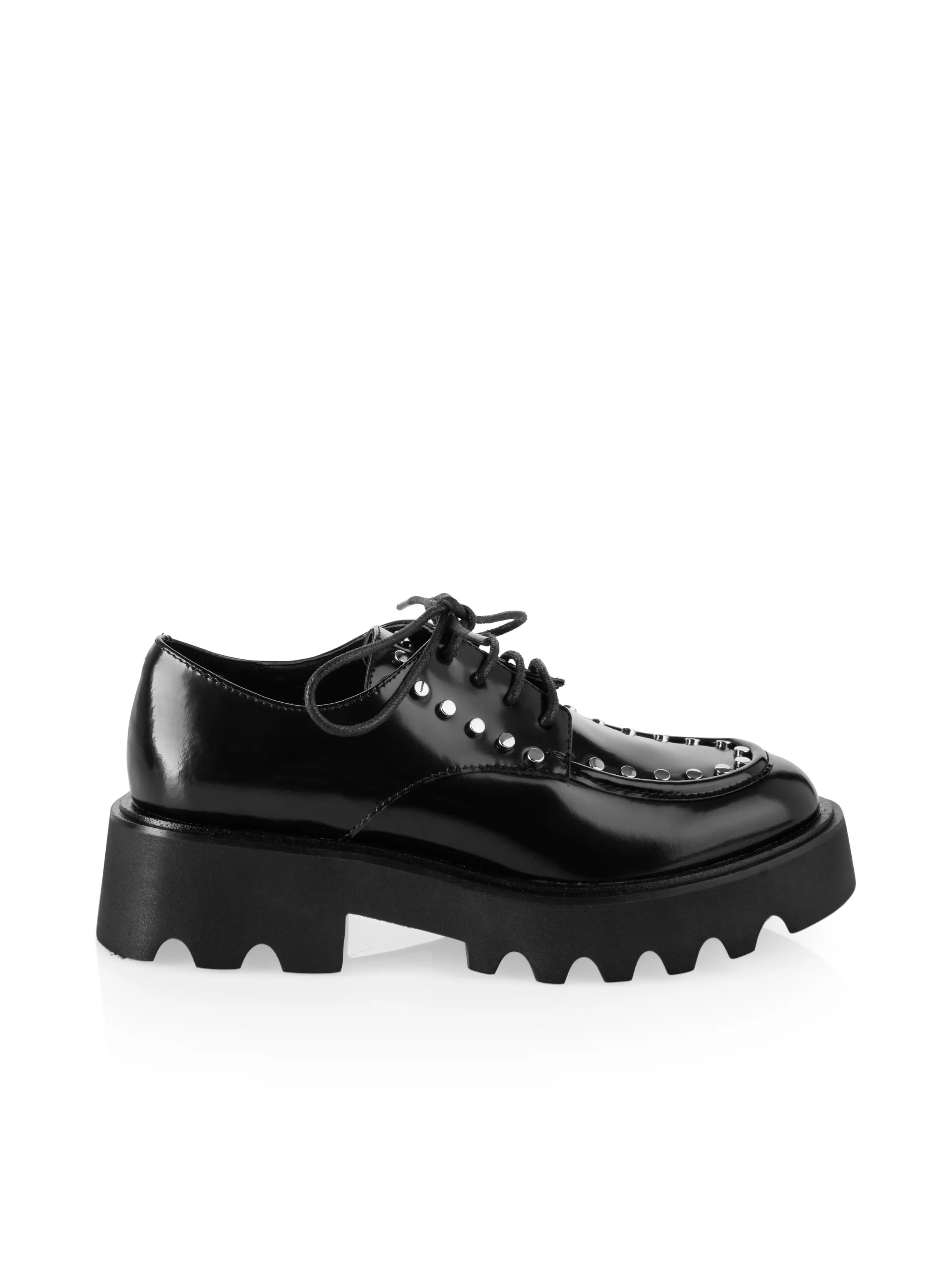 Halbschuh aus Lackleder|Dieser Halbschuh zum Schnüren setzt ein echtes Statement durch seine hohe Plateau Sohle und die eingearbeiteten Nieten. Die leicht glänzende Lack-Optik ist aus Kalbsleder gefertigt. Dadurch besticht der Schuh ebenfalls mit seiner hohen Qualität.|Runde Kappe|Mit Plateau Sohle|Nieten Details|Aus hochwertigem Kalbleder|Absatzhöhe: 0 mm