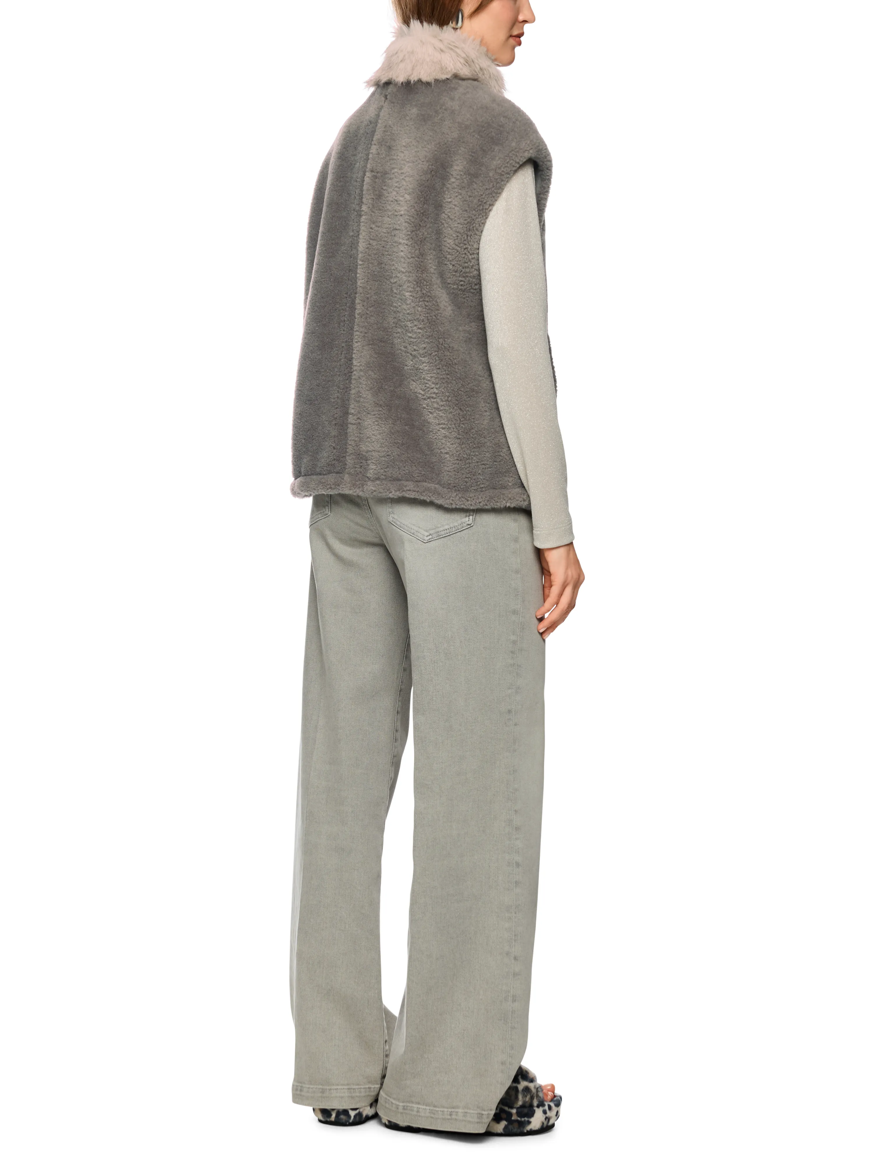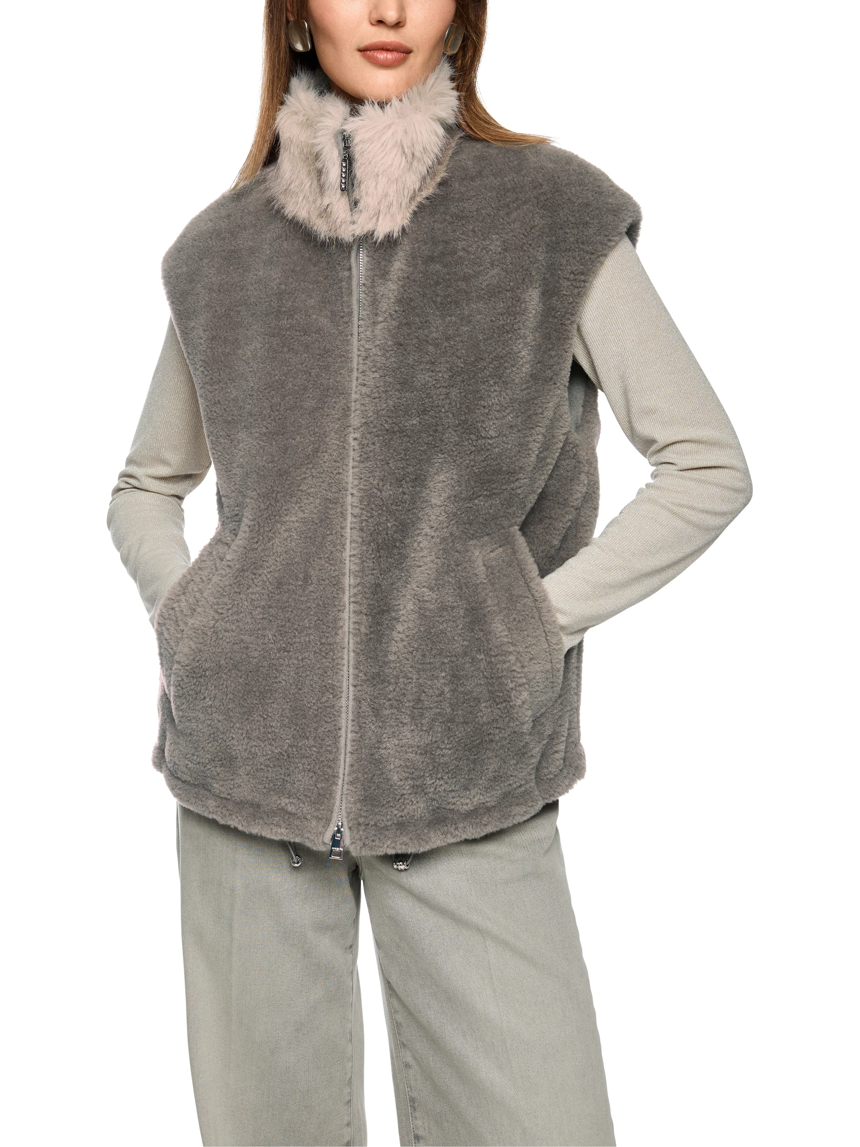 Kuschelige Weste mit Fake Fur Kragen|Diese kuschelige Weste mit langhaarigem Fake Fur Kragen sorgt für stilvolle Wärme an kalten Tagen. Der Kragen ist innen weich gefüttert mit Wolle. Überschnittene Schultern und praktische Eingrifftaschen runden das Design ab. Der Zwei-Wege-Reißverschluss sorgt für Flexibilität. Ideal für den modernen Layer-Look.|Locker geschnitten|Fake Fur Kragen|Zwei-Wege-Reißverschluss|Eingrifftaschen|Das Model ist 179 cm groß und trägt N3/38.
