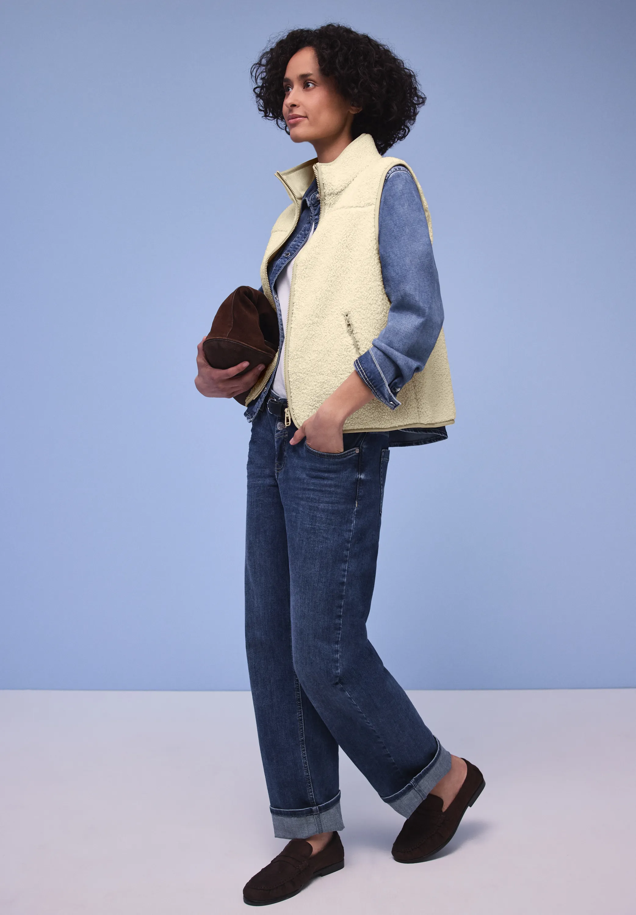 Diese kuschelige Teddy-Weste von Street One schenkt dir ein besonders weiches Tragegefühl und ist perfekt für trendige Layering-Looks. Der Stehkragen, der Reißverschluss und seitliche Taschen mit Zipper machen sie funktional und modern. Die ärmellose Form lässt viel Bewegungsfreiheit und eignet sich ideal für Übergangstage. Ein gemütliches Must-have für casual Outfits. Teddy-Weste Casual Stehkragen Ärmellos Besonders weich Material: 100% Polyester