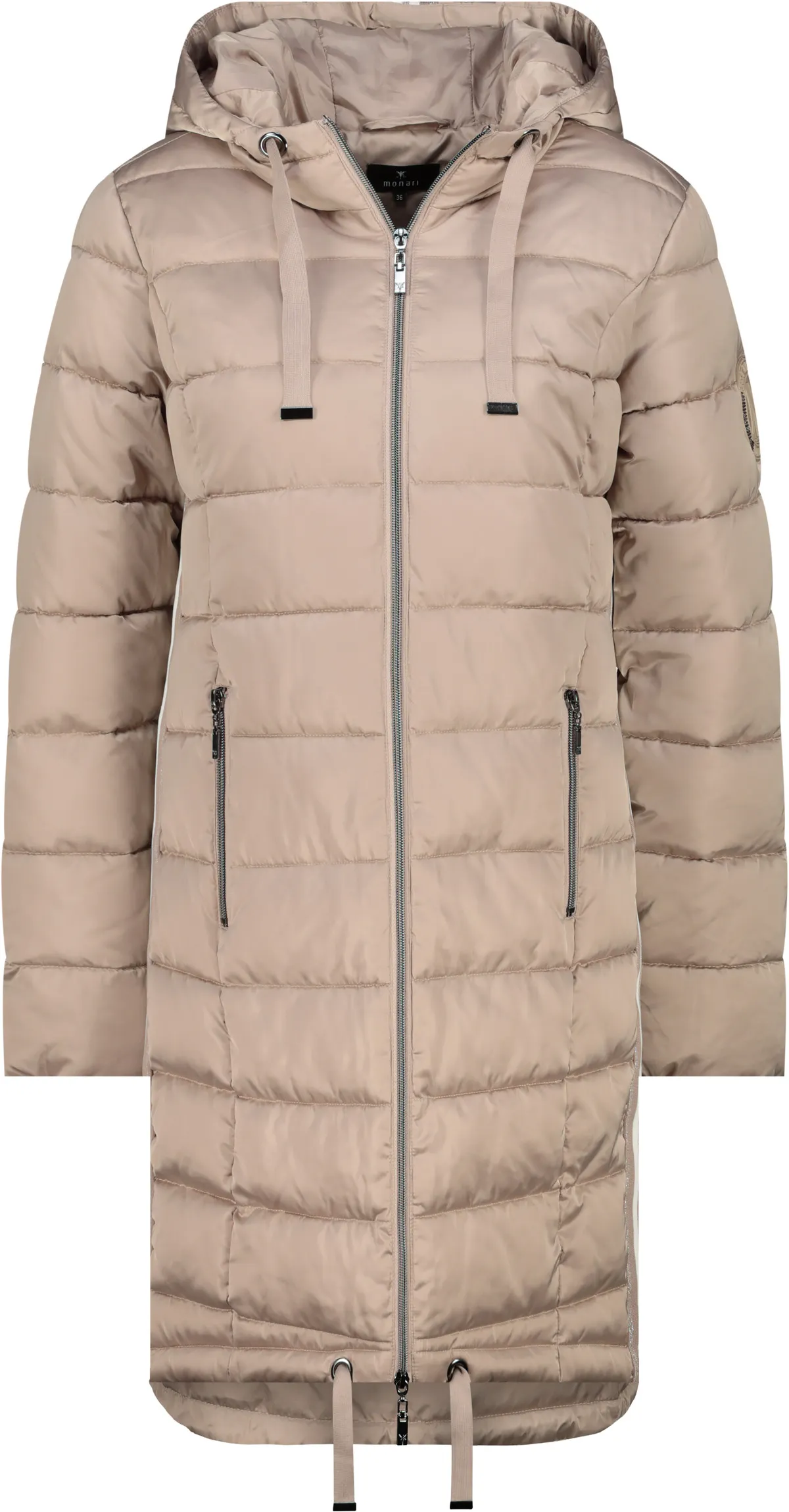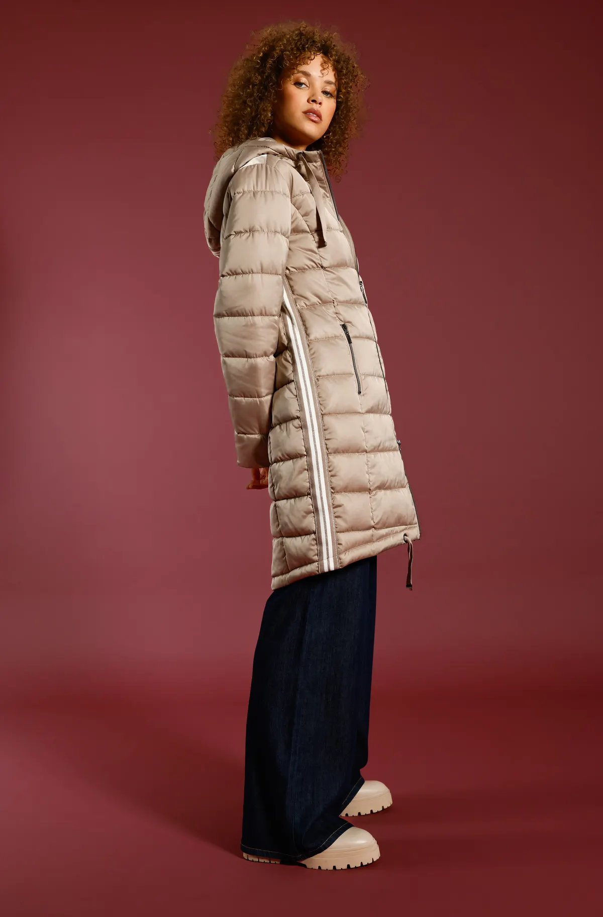 Dieser moderne Steppmantel kombiniert Komfort mit Stil. Glänzende Lurexstreifen setzen modische Akzente, während die Kapuze mit Bindeband und der verlängerte Rücken zusätzlichen Schutz bieten. Der Regular Fit sorgt für eine bequeme, zeitlose Passform.